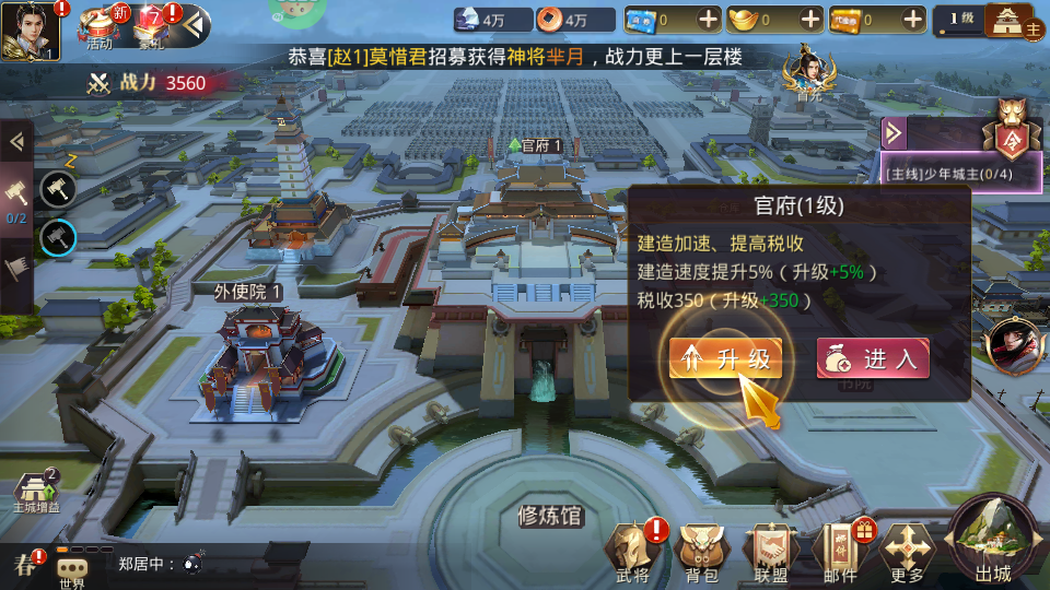 3、完成官府升级任务后,还可领取丰厚奖励,加快发展速度。