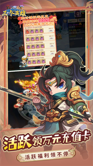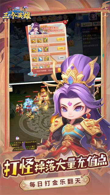 三个英雄0.1折是一款2D卡通写实风格的网络游戏,此版本玩家内置永久的0.1充值折扣,即充值128只需1.28,玩家登录创角还能领取海量的道具资源奖励。游戏以经典三国为背景,打造出一个精美如画的奇幻世界。在这里,您将遇见众多造型独特的三国英雄,体验丰富多样的经典玩法,开启一段轻松愉快的冒险旅程。