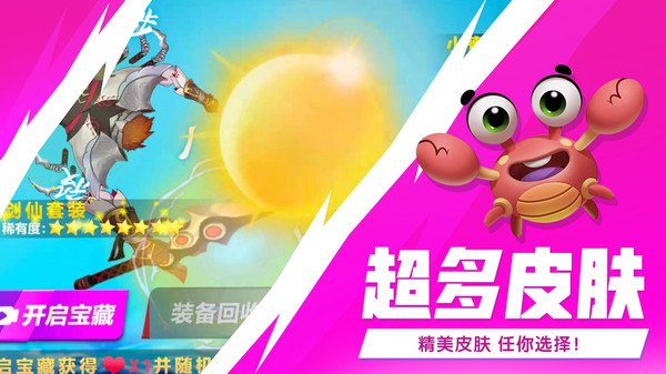 最强大螃蟹是一款卡通风格的趣味休闲娱乐小游戏,游戏中玩家将要控制一只小螃蟹在各种地图场景中展开一场冒险生存之旅,其操作非常容易,玩家只需要滑动屏幕左下方的遥感就能控制螃蟹的方向,按住右边的闪电图标就能让螃蟹前进啦!螃蟹会轻松干掉沿途的所有障碍物,有些障碍物破碎时还会掉出分数以外的装备道具,玩家可以在游戏结束后获得这些搜集的装备道具,给自己的螃蟹配备。目前游戏内提供了多种武器装备可供玩家解锁体验,不同的武器都有着其专属技能。应用信息