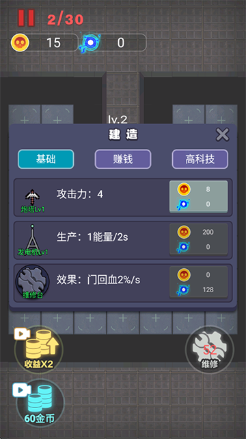 2、关门上床发育,建造武器,升级床和门,噬梦者攻击门的时候我们可以点击右下角的维修;