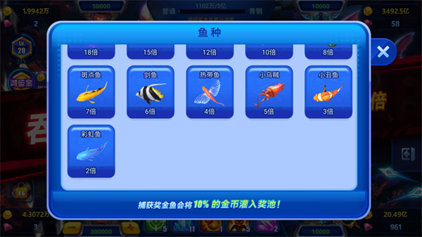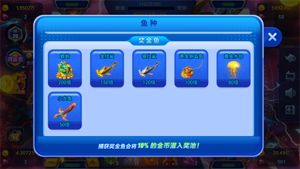炮台是游戏里最重要的道具,相对来说捕鱼时使用的倍率也是相当重要的,那么在进行游戏的时候,我们要学会根据不同的鱼类、BOSS来选择不同的炮倍。比如在刚进入渔场的时候,BOSS如果还没出现,我们可以切换成低倍炮,捕抓小鱼热热身,节省金币,等待BOSS出现之后,再切换成高倍,实现捕鱼奖励最大化,从而在游戏中获得更多的金币。