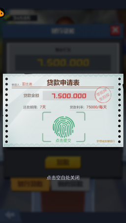 梦想城银行为广大董事长提供了贷款业务,零抵押免担保,只要还没达到公司财务部的贷款上限和银行的贷款项上限就可以一直贷款,用未来的钱来帮助公司发展。钱是贷了,还不上怎么办呢?相信这也是董事长非常关心的一个问题。董事长公司的收入每天都在快速增长,今天贷的钱占公司收入的10%,过两天可能只占公司收入的1%了,所以完全不用担心这个问题,放心尽量贷满上限就好。
