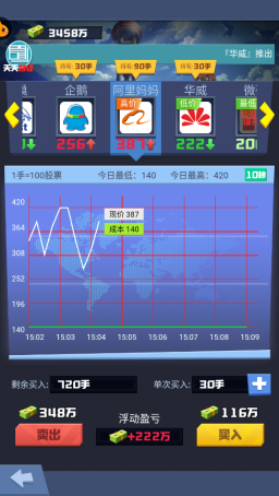 《明日大亨》中的股市玩法可以说是业界良心,资本大慈善家,只要懂得“低进高抛”就能赚取大量的现金。在前期消耗少量金币提升单次股票买入手数,这样就可以大大加快赚钱的效率了。还有每天尽量都用尽500手的买入限制,这样才能最大化收益哦。