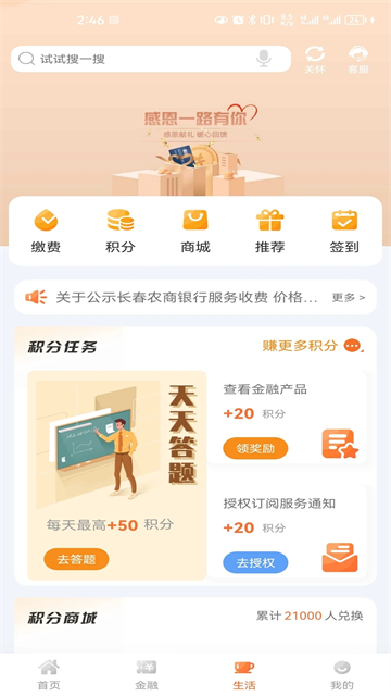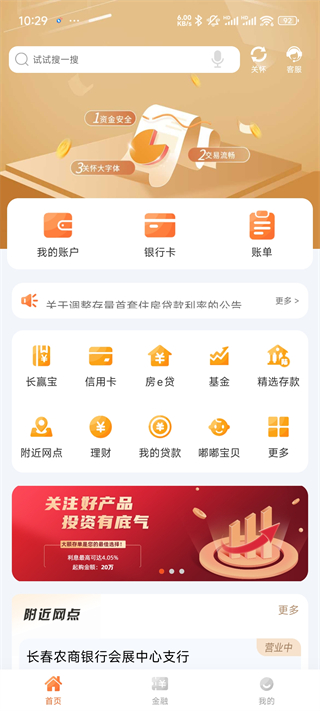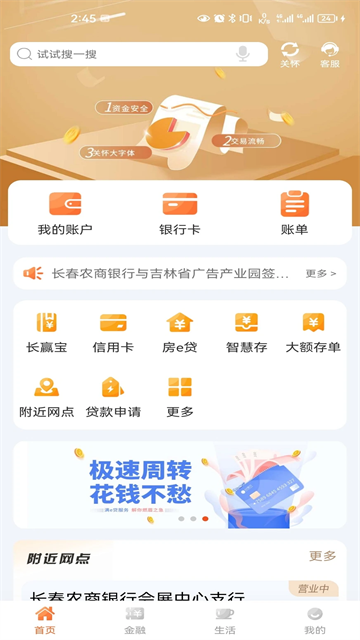 长春农商银行生活助手提供理财计算器、网点地图查询、ATM分布地图查询;提供智慧存、长赢宝、大额存单、热力缴费 信用卡等功能。