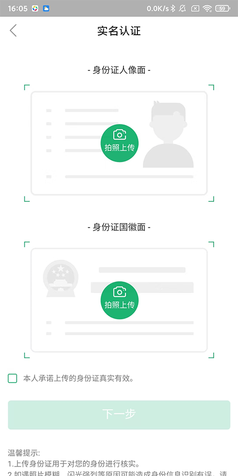 4、绑定银行卡前需先进行上传身份证正反面进行实名认证。