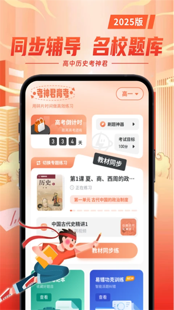 高中历史app是考神君系列中专攻历史学科的辅导学习软件,同步知识辅导,各类常考题型,筛选各类历史专题常考集锦,分分钟带领孩子从国内历史到国外史,一起揭开历史的神秘面纱,更有全面的板块学习,结合视频讲解,还有错题本、题库功能,让学习效率更高,适合高考备考的同学们。同时也是一个非常好用备考工具,可以设置考试时间和考试目标,针对性复习,闯关模式,包含各地考试题型,充分利用碎片化时间,让你随时随地带上耳机就开始学习,有需要的用户可下载使用。