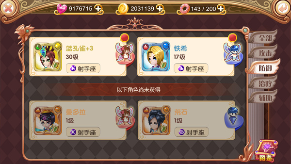 通过界面右侧标签可知,叶罗丽手游根据四种职业定位对角色们进行了分类,分别是攻击、防御、治疗、辅助