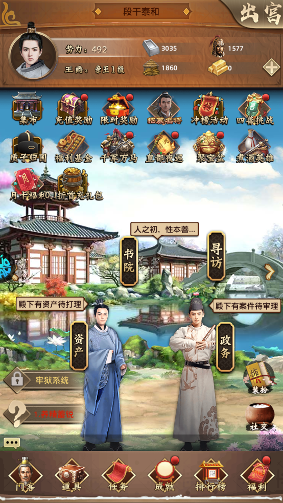 听说新老玩家都有很多福利,特别是充值优惠力度很大,0.1折简直太划算了!而且游戏里的门客系统也很有意思,像魏征、杜甫这样的历史人物也能成为你的助力。升级门客需要银两,等级上限还能通过提升王爵解锁更多。