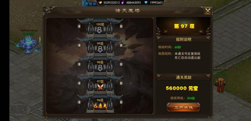 任务描述:玩家通过在城中找到诸天魔塔的建筑或者通过右上角活动图标的诸天魔塔打开界面,点击“立刻挑战”,进入塔内开始挑战BOSS。每层魔塔都有挑战所需的等级和胜利条件,100层之后的魔塔挑战不可以携带宠物出战。每当成功挑战一只BOSS之后,会有丰厚的元宝奖励,挑战层数越高,元宝奖励就越多!