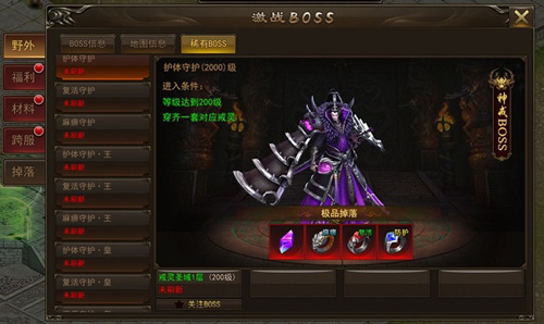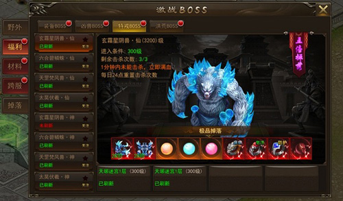 三、另外凑齐戒灵还可以激活戒灵地图。在福利BOSS分类中有一类特戒BOSS,在这里大家能更多地刷出戒灵,助力大家更好地收集戒灵。而在稀有BOSS中的“守护”系列BOSS中,也可以刷出升级戒灵用的材料和戒灵本身。总之,想要刷戒灵相关,找这些BOSS就对了。