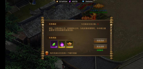 任务描述:任务分为多种类型,完成后可获得“灵宝精华”和“仙力”奖励,每日可完成5环任务,当5环任务全部完成后,还可获得一份额外的奖励!