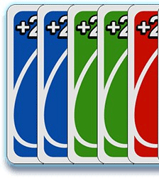 +2牌——与引导牌同色或引导牌为+2牌时可以打出,打出后你下家罚两张牌并被禁手,由你对家继续出牌。