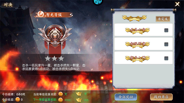 3、对决;类似排位玩法,击杀一名玩家升一星;被击杀则掉一颗星;