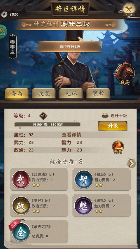 5、获得的元宝铜钱可以给你的将臣进行升级,提升各方面的等级属性;