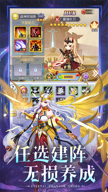 永恒幻剑0.1折版是一款二次元卡牌回合制放置游戏,玩法挺丰富的,尤其是各种提升战斗力的方式,比如高星、升级、转职、装备和侍从培养,再加上策略性的英雄位置安排,感觉战斗会有很大不同。游戏里还有多种挑战玩法,比如诸神争霸和元素塔,应该能玩很久。