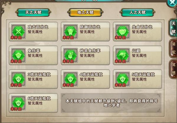 天赋只有在装配界面装备后才会获得天赋属性,每个角色最多可解锁10个天赋装备孔,前6个的天赋装备孔激活条件需要角色到达一定等级时,并花费绑定元宝解锁(绑元不足时可用元宝)。后4个天赋装备孔需要角色的VIP等级到达对应条件时并花费元宝解锁。