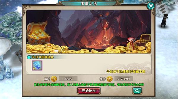 每次挖宝角色都需要一张藏宝图,藏宝图可在“福利”界面神秘寻宝中兑换或在商城中购买。