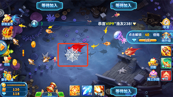 1、进入渔场后点击想要捕获的鱼,大炮就会发射捕捉网,连续点击有几率提升捕捉概率;