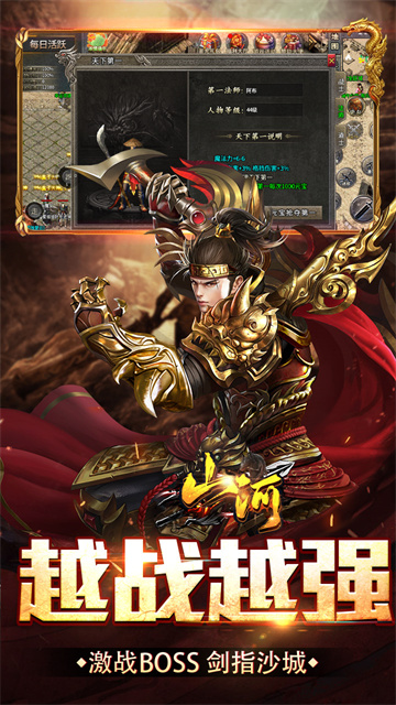山河(爆爽攻速雷霆单职)是一款单职业高爆攻沙传奇手游。采用顶级3D引擎打造,画面精美流畅,技能打击感爆棚,支持千人同屏攻城、全地图自由PK、开放交易无绑掉落,让您体验最纯粹的传奇乐趣。并且,游戏上线即送豪华礼包,升级打怪爆实物兑换充值,刀刀暴爽、速战BOSS!沙城争霸热血重燃,兄弟集结再战荣耀!快来体验超高爆率、无限激情的单职业传奇世界!