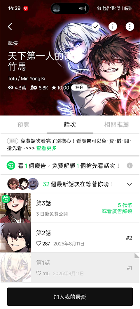 3、每日皆会更新近十部的连载漫画作品,让使用者免费收看,多元化的题材可以满足各种不同类型的读者,