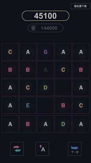 这款游戏叫“合他个ABC”,是等灯工作室开发的益智消除游戏。界面很简洁,黑色背景加上五颜六色的字母方格看起来挺有科技感。玩法有点像2048,但更偏向于消除类游戏,点击空格就能让上下左右相同字母合体消除,从A到G一步步挑战,越合成越多分数就越高。这种设计既烧脑又有意思,玩起来特别刺激。