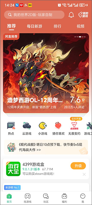1、首先在手机上打开4399游戏盒,如下图所示,包含了推荐、新游、排行、视频、小游戏等多种类型;