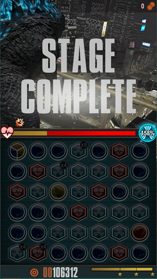 2、该游戏结合了哥斯拉的破坏活动和三消游戏。
