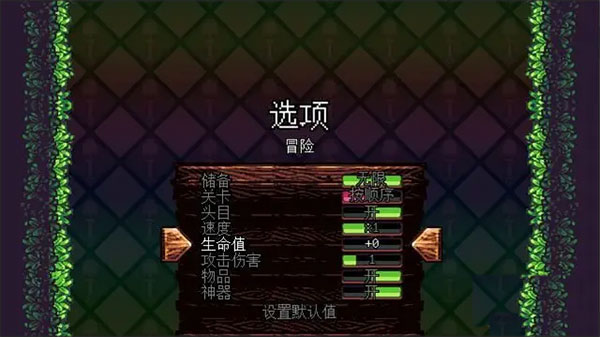 4、选项界面可调节游戏的各项设置,其中冒险设置可以调节冒险模式的游戏机制。储备表示玩家的命数,默认是1,也就是死亡之后全部重来。调高之后玩家死后可以在当前关卡直接复活,建议初次游玩调成无限或者稍高一点的数值。