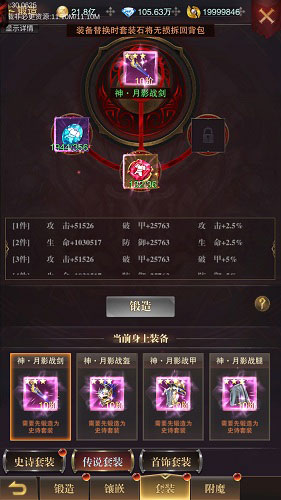 注意!不同阶数的武器和防具会打造成不同类型的套装,玩家打造套装达到一定件数(1-6件)可触发套装效果,获取额外属性加成。