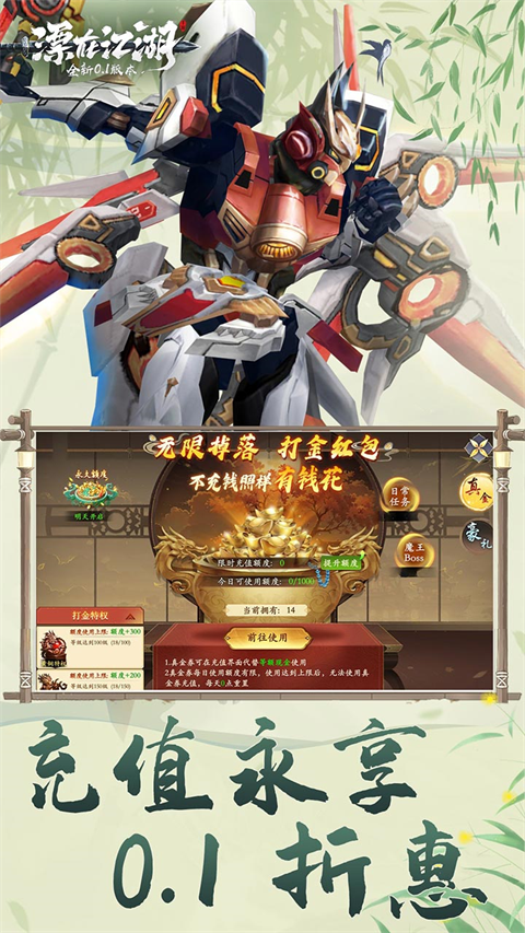 这里给大家带来的是漂在江湖0.1折版,登录即送0.1折新特权称号,首充仅需 0.06元,百倍钻石,资源多多,奖励多多,战力狂飚,别人百倍充值才能与你战力媲美,甩他们三条街!喜欢的玩家还不快来下载,开启你的江湖闯荡之旅吧~