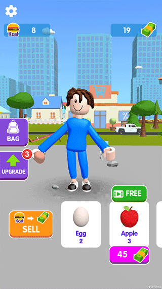 2、进入游戏后,玩家将需要将自己打造一个绝对的吃货,点击屏幕可以让角色进行吃下方的食物,每个食物下方的数字代表吃完获得的金钱;