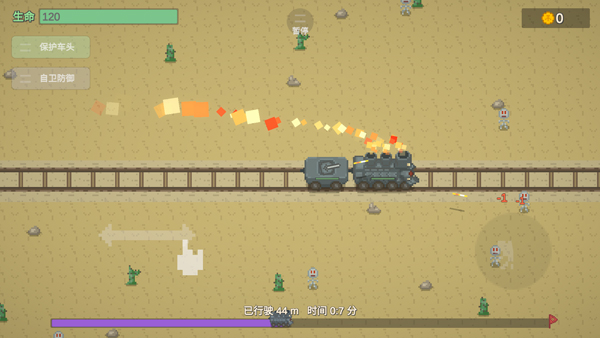 1、驾驶列车,在黄沙废墟中前行,消灭畸变怪物。