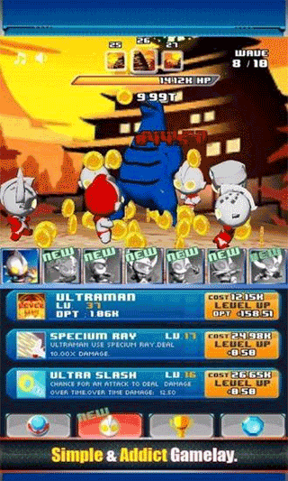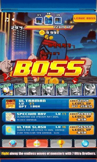 2、你可以切换奥特曼来进行攻击,下方可以用金币来升级和获取新的奥特曼。
