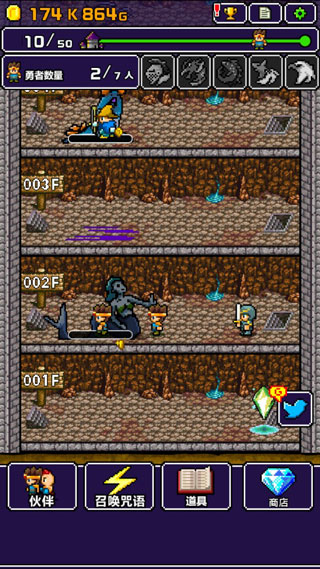 玩家点击需要挑战的楼层便可开始挑战,倘若在挑战的过程中,遭遇更高级的要怪,此时也无需担心,拥有会返回下下一层继续开始,在此期间你可以升级伙伴的威力,升级的过程需要消耗金币,而斩杀怪物是收集金币必要的途径。