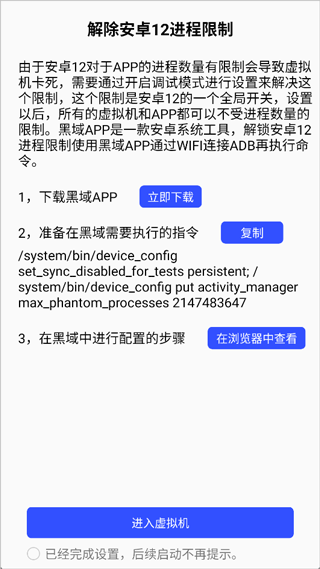 1、首先需要说明的是手机是安卓10以下用户可以正常启动虚拟机,如果是安卓12用户可在本站下载黑阈app进行进程相关优化设置,设置方法虚拟机中有详细教程可参考,用户照着做就行