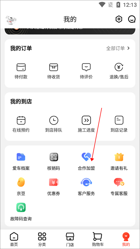 打开并登录京东养车app后进入【我的】页面中点击【合作加盟】