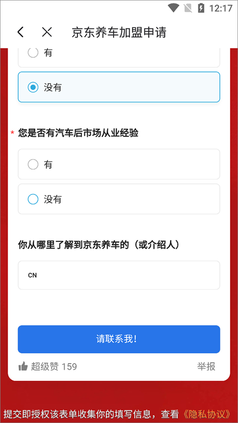 在打开的新页面中填写姓名、手机号,选择省市县(区),以及其它相关信息后点击【请联系我】即可等待工作人员联系