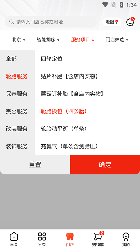 1、用户打开并登录京东养车app后(即京东京车会),进入门店页面中点击【服务项目】,在弹出的下拉选项中选择服务项目,例如这里选择轮胎换位