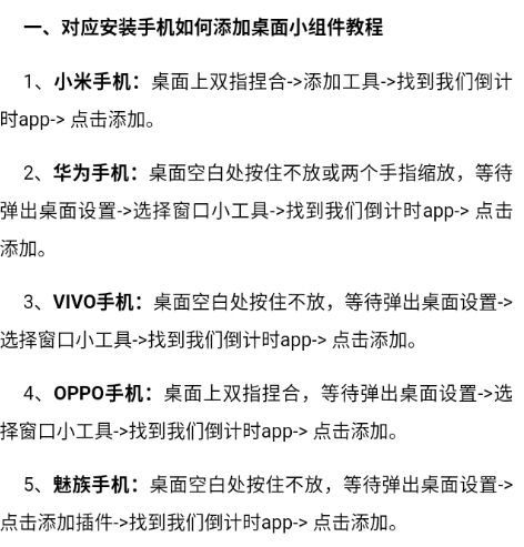 这个app还能直接添加到手机桌面,操作起来也挺方便的,不同品牌手机的操作方法稍微有点不一样,但基本都是长按桌面或双指缩放就能找到设置选项。软件里还有好多功能,比如倒计时精确到秒、每日待办事项提醒、日历提醒等等,完全可以满足各种时间管理的需求。
