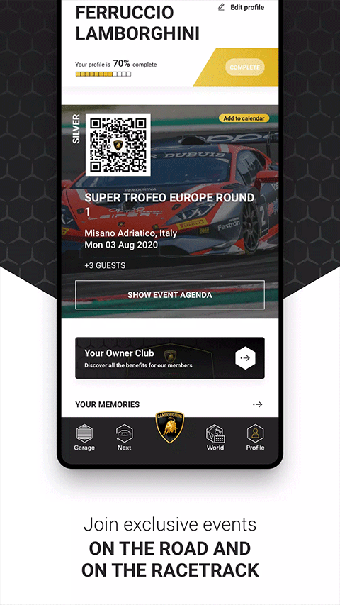 兰博基尼UNICA是专为兰博基尼车主们提供的一款专属应用程序,英文名为Lamborghini Unica,使他们只需用手指轻按一下即可连接到这家位于圣亚加塔博洛涅塞的汽车制造商。同时其也是一款定制且内容丰富的应用程序,可作为无价指南,让您随时了解兰博基尼产品系列的最新消息、跟踪活动或生活方式活动,并接收有关新购买汽车生产的实时更新并轻松联系参考经销商。