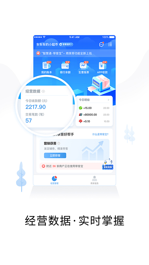 智慧商户通app是一款专为商家设计的新一代店铺管理软件。它让商家可以随时随地查看店铺动态、到账通知和实时交易记录,不错过每一笔账目。除了收账提醒,还提供丰富的管理功能,比如订单交易、商品、评价和售后等快捷入口,方便商家快速查看客户评论并及时调整经营策略。