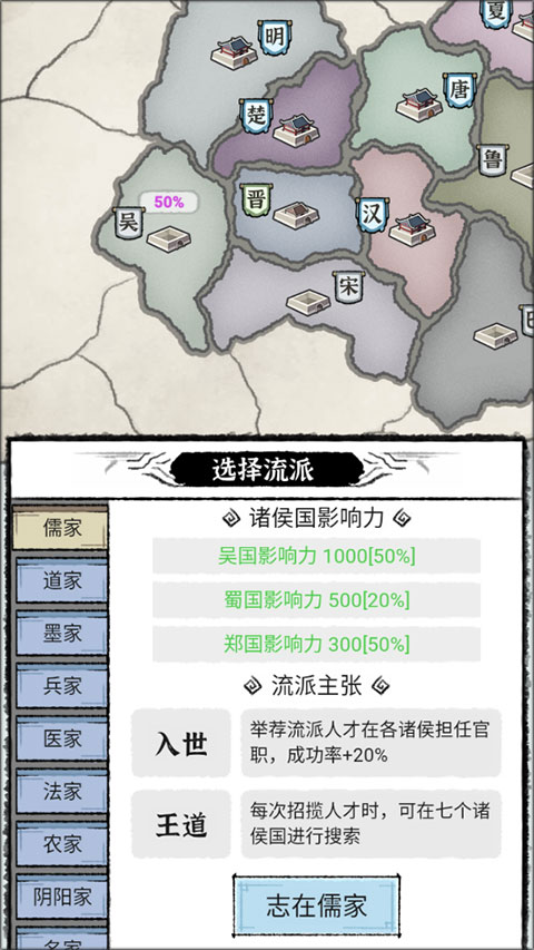 1、选择流派 — 百家学派各有专长,对各方势力的影响程度也皆不同,你可以自由选择喜欢的流派开始管理,主张自己独特的信念。