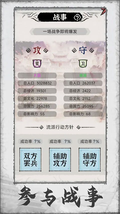 4、参与战事 — 谁说学者无沙场?在这里你可以通过流派的影响力参与到各方势力的战斗中,并利用自己主张的方针左右战事走向。