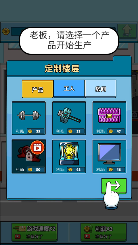 2、然后即可正式开始游戏,点击左下角游戏速度称×2,玩家可提升头游戏速度,以及提升利润;