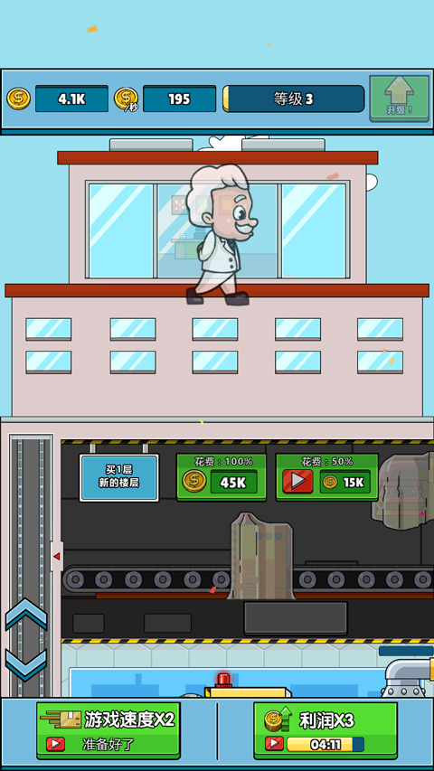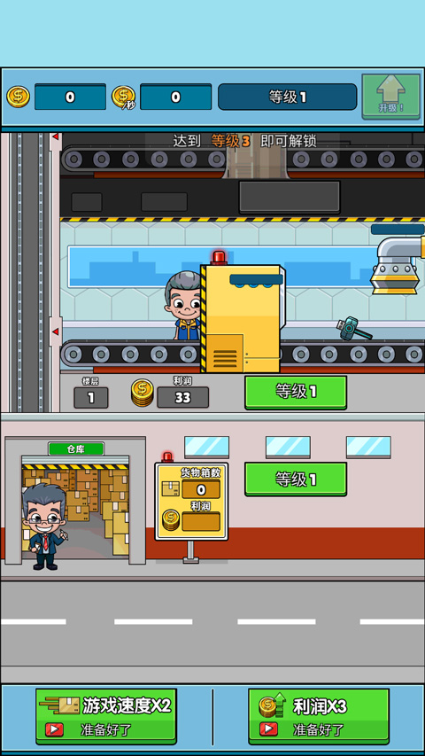 而在玩法上,游戏相对来说非常简单,由于本身采用的放置模拟机制,因此在操作上并不需要玩家有多么复杂的操作,而你只需在运输金币达到一定量级之后,完成对楼层产品线的升级改造即可,同时针对产品的选择以及线上工人的工作效率进行适当的升级便可。感兴趣的朋友不妨下载试试看,相信一定不会让你失望的。
