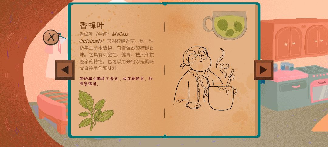 【郊外】乘小船去奶奶家,客厅右侧拿到玫瑰果。客厅左转花房内与奶奶对话,客厅右转厨房内继续与奶奶对话,得到姜、香蜂叶、玫瑰果。