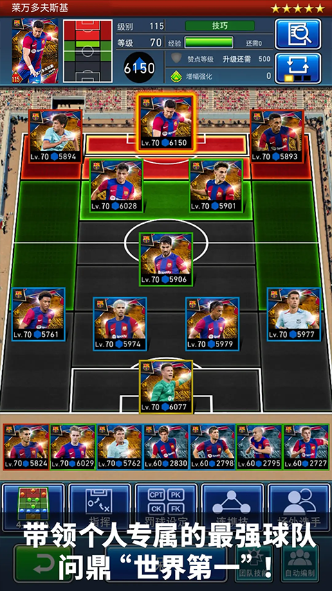 迅速集齐全队五星球员,切忌不要乱升级,只给五星球员升级,甚至90分的球员你可能升级到一定程度,比如40级就可以不用升了,给其他后面抽到的93+的球员升,核心原理在于,战斗力是根据你球队上场和替补决定的,而每个球员的战斗力都有天花板,尽量把宝贵的经验和金钱用在训练高分球员上,训练后期金钱需求是很大的!