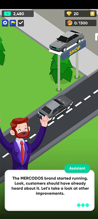 1、非常简单有趣的模拟经营的玩法设计,玩家要通过卖出更多的汽车快速赚钱;