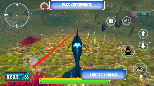 4、多次点击上图所示“next”解锁教学后,我们接下来就可以操作虎鲸进行游玩了