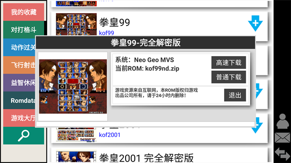 1、丰富的游戏资源:Kawaks模拟器内置了上千款主流街机游戏,包括《拳皇》系列、《街头霸王》系列、《合金弹头》系列等经典作品,覆盖了动作、格斗、射击、休闲等多个游戏类型,满足不同玩家的需求。